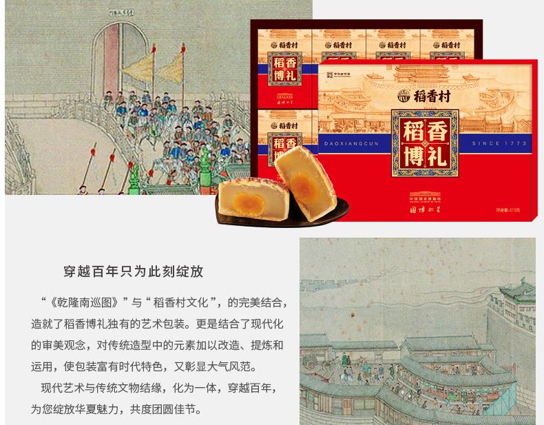本次稻香村集團(tuán)與中國國家博物館首次跨界合作,將國家博物館國寶級書畫珍品《乾隆南巡圖》圖像運用至稻香村月餅禮盒包裝上,展示了昔日乾隆皇帝南巡的情景也為稻香村月餅增加了濃濃的中國味道。