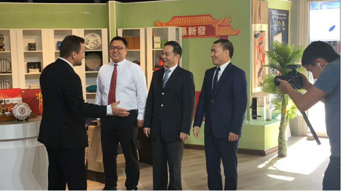 稻香村集團參會代表劉志勇(左二)接受哈薩克斯坦當?shù)仉娨暸_采訪