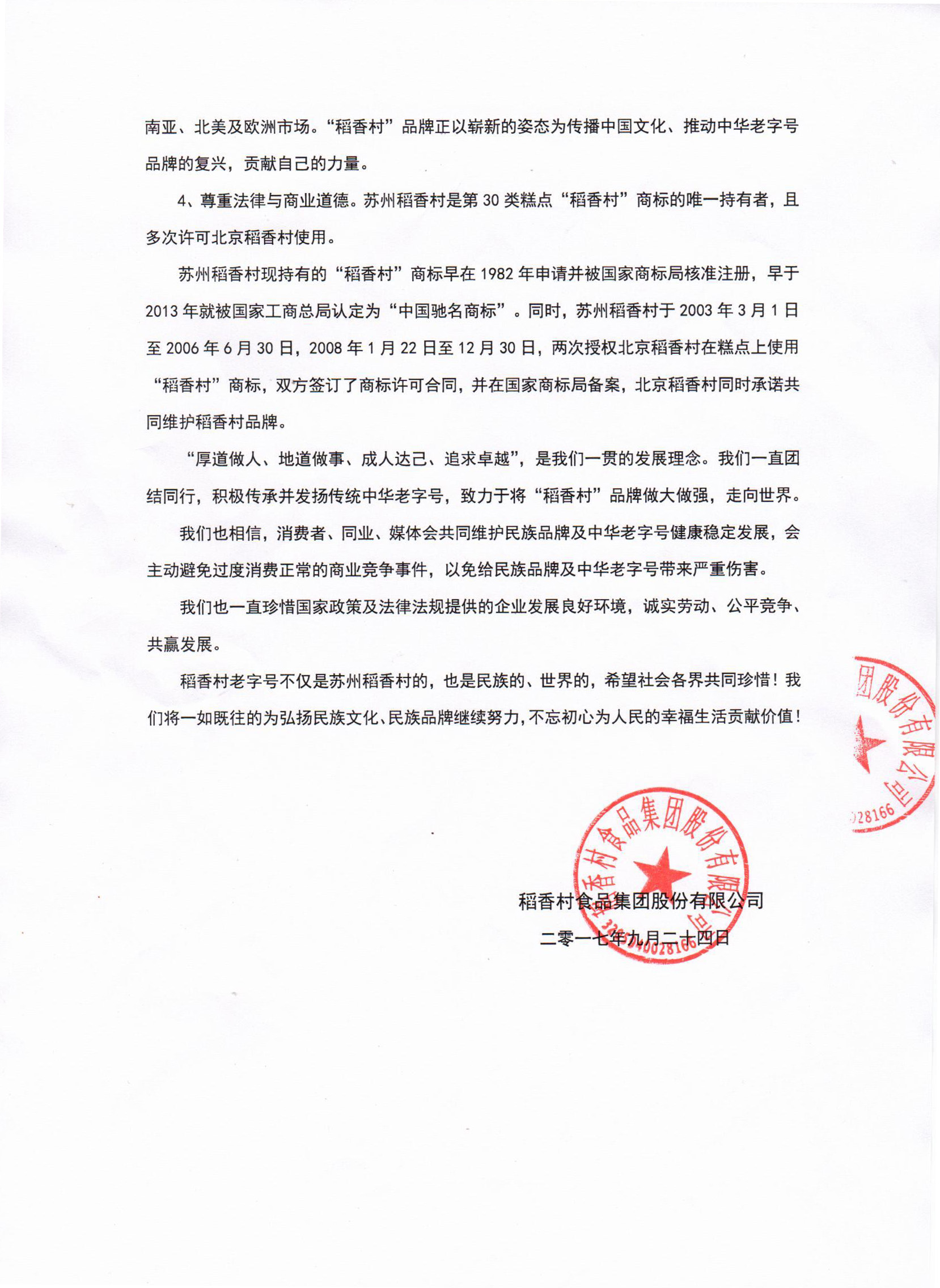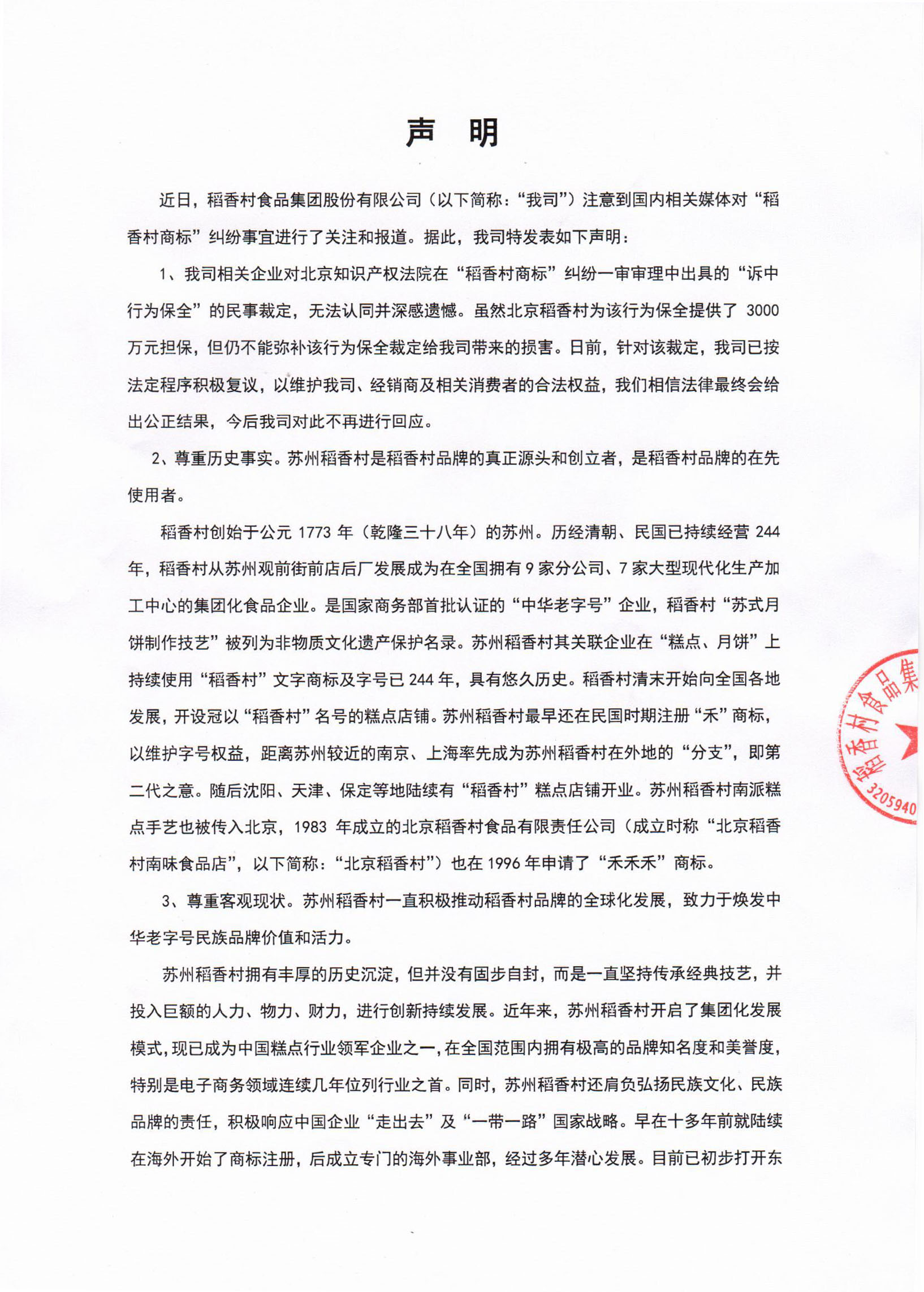 稻香村集團(tuán)關(guān)于“稻香村商標(biāo)”糾紛事宜的聲明: ???