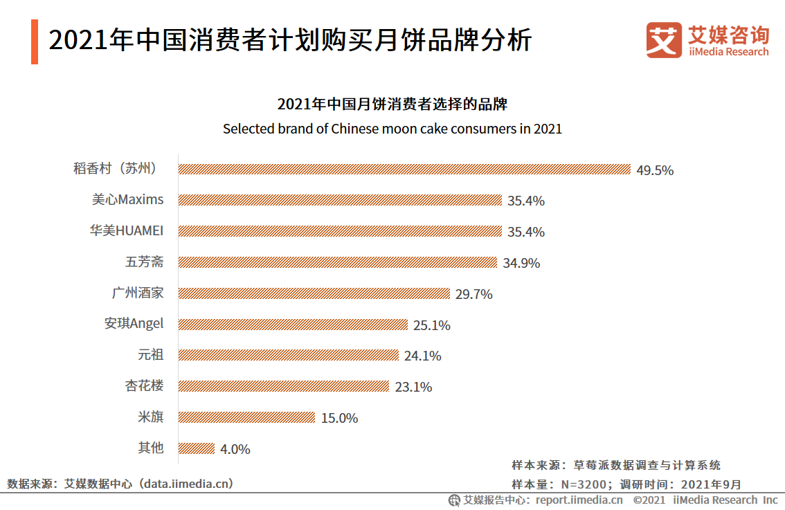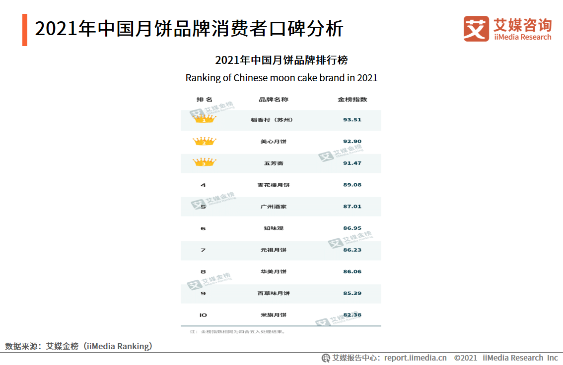 根據(jù)iiMedia Research(艾媒咨詢)《2021中國月餅行業(yè)新消費趨勢研究報告》數(shù)據(jù)顯示,2021年消費者在月餅品牌選擇上,稻香村(蘇州)以49.5%的占比位居第一。此外,在艾媒金榜發(fā)布的《2021年中國月餅品牌排行Top10》中,稻香村(蘇州)以93.51的金榜指數(shù)排名第一,該排名以企業(yè)綜合實力指標、全網(wǎng)媒體傳播態(tài)勢評價指標、用戶口碑監(jiān)測指標等綜合評選而出,消費者對蘇州稻香村月餅的評價和口碑普遍較高。