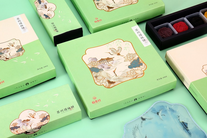 蘇州園林餅禮盒設(shè)計融入蘇式園林文化元素,以淡雅綠色為基礎(chǔ)色調(diào),遠(yuǎn)有太湖石、湖上有亭,近景有水面鶴,再以柳葉、荷花做點(diǎn)綴,極盡風(fēng)雅。另外糕點(diǎn)取景于“滄浪亭、大觀園、拙政園、虎丘塔”,別有一番雅致。園林系列設(shè)計讓消費(fèi)者品嘗姑蘇美味的同時,也帶領(lǐng)消費(fèi)者游歷蘇州名景,感受蘇州山林意趣,使其對蘇州增添一份不一樣的感觸。