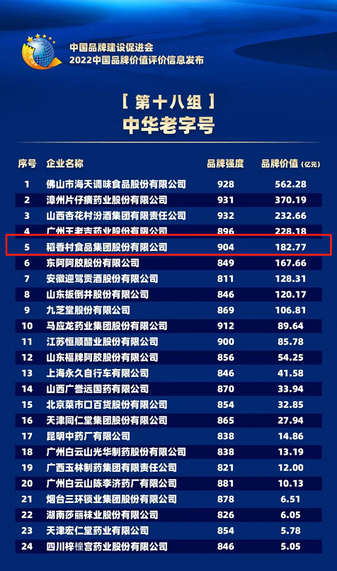 9月5日,新華社、中國品牌建設(shè)促進(jìn)會、中國資產(chǎn)評估協(xié)會在京共同主辦“2022中國品牌價值評價信息發(fā)布”線上活動,會上正式發(fā)布了2022年中國品牌價值評價結(jié)果。稻香村集團(tuán)(蘇州)不負(fù)眾望,最終以904的高品牌強(qiáng)度和182.77億元的品牌價值強(qiáng)勢上榜。