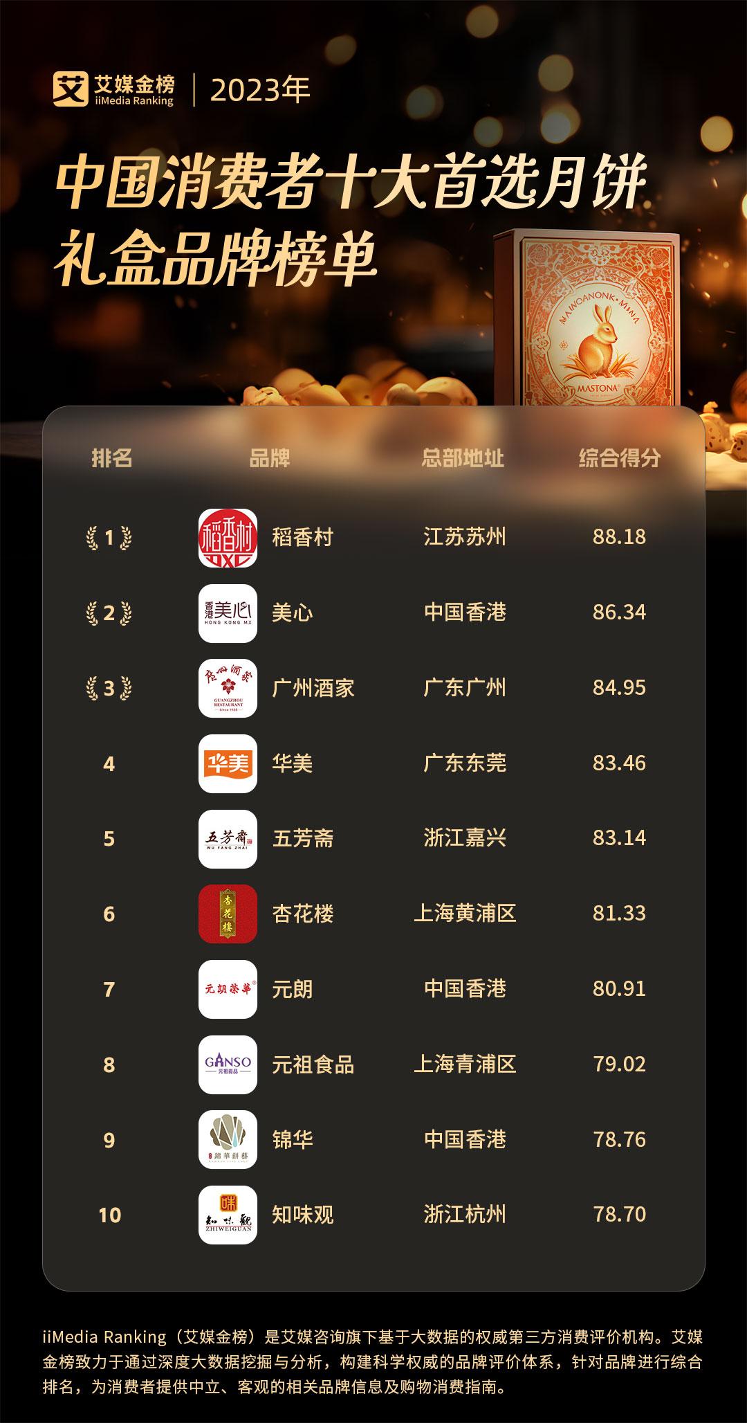 稻香村月餅領銜《2023年中國消費者十大首選月餅禮盒品牌榜單》