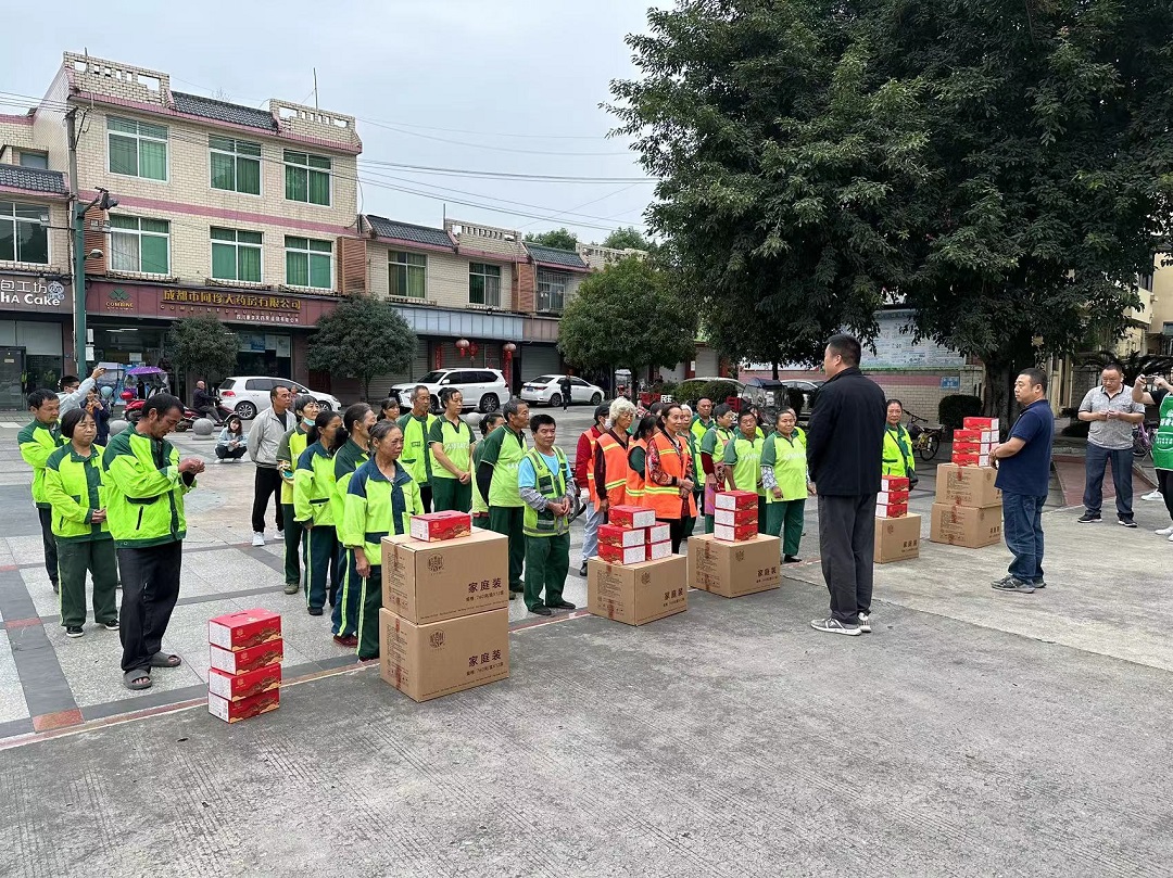 9月26日,稻香村集團成都公司的工作人員來到成都市新都區(qū)軍屯鎮(zhèn)慰問一線環(huán)衛(wèi)工人,為他們送去中秋月餅與節(jié)日祝福的同時,呼吁社會尊重環(huán)衛(wèi)工人的勞動成果,希望越來越多的人從自身做起,愛護環(huán)境,共同維護美好家園。