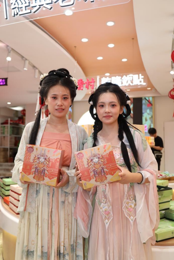 (身著漢服的年輕人展示稻香村國(guó)潮月餅禮盒)